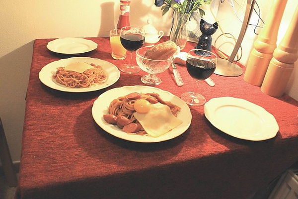 傍晚你嚷著想吃義大利麵,於是我們立即跑到超級市場買了材料,由我難得親自下廚,一起飲著紅酒、一起談天、被偌大的不真實擁抱著,但是,我好快樂。